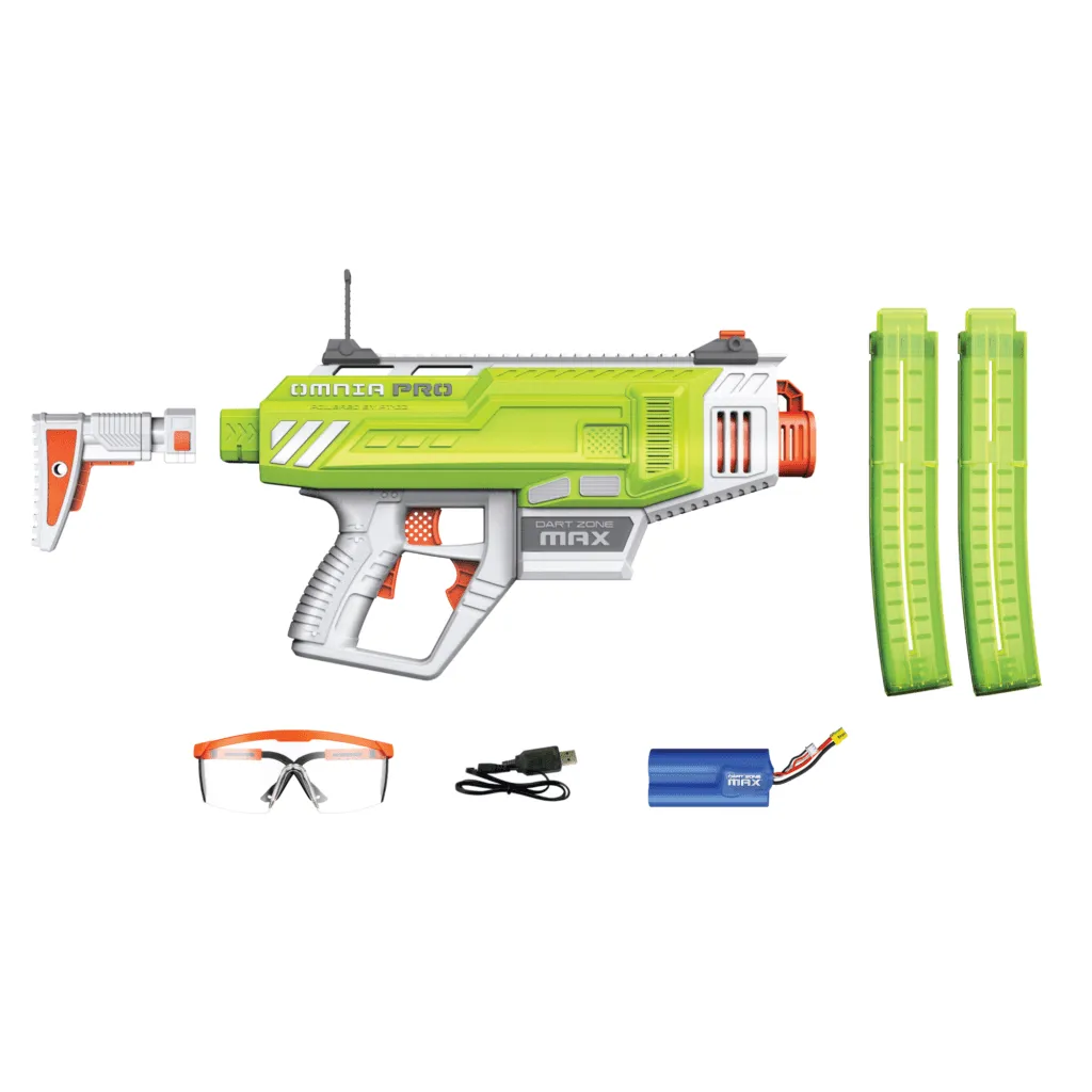 Flywheel Blaster 3 Firing Modes Rechargeable Lithium-Ion Battery Adjustable and Removable Sights Adjustable and Removable Stock Fires 7 Darts a Second